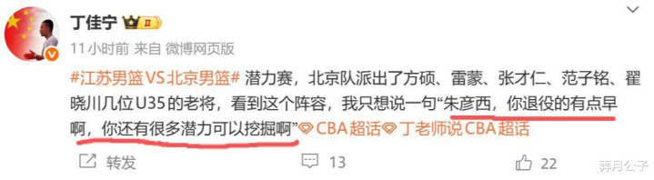 结果没曾想北京和江苏的比赛后,北京队潜力赛派出的阵容更加夸张,首发阵容除了翟晓川、方硕这两位快要退役的老将,还有范子铭、雷蒙、张才仁这几位中生代,5人加起来154岁。这也再度引起了球迷的讨论:“俱乐部故意恶心篮协的吧?”、“这叫潜力赛,北京这五个人哪个还有潜力?”、“平均年龄30.8岁,难道30岁是当打之年吗?”